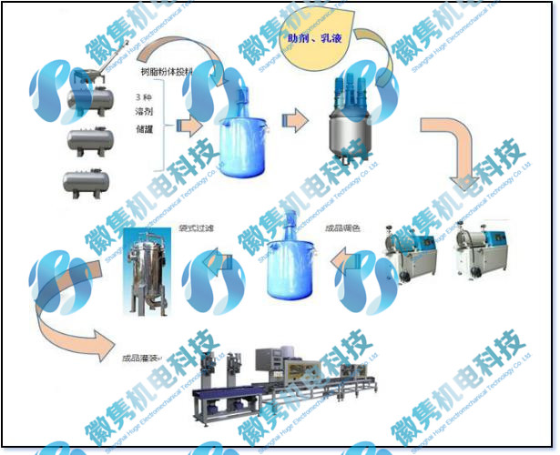 3.調(diào)色系統(tǒng):研磨出料經(jīng)泵輸送到調(diào)色釜,根據(jù)生產(chǎn)計劃進行調(diào)色;