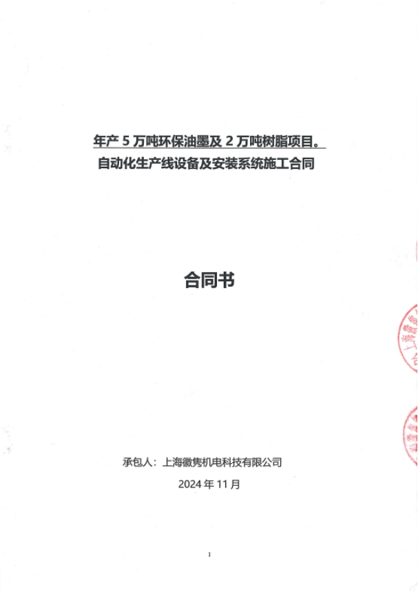 2024 年11月12日,上?;针h機(jī)電科技有限公司成功簽約安徽某大型年產(chǎn)5萬(wàn)噸油墨及2萬(wàn)噸樹(shù)脂自動(dòng)化生產(chǎn)線項(xiàng)目,雙方精誠(chéng)合作,共同努力,開(kāi)啟油墨、樹(shù)脂生產(chǎn)領(lǐng)域自動(dòng)化生產(chǎn)線的新篇章,相信在雙方的共同努力下,必將為油墨、樹(shù)脂行業(yè)帶來(lái)新的活力和機(jī)遇。