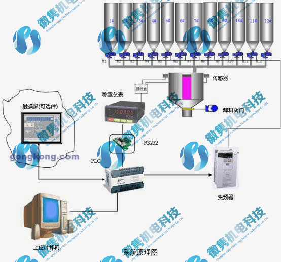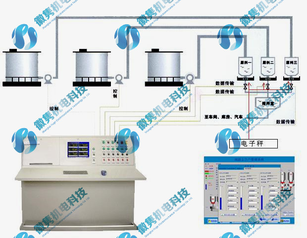 上位機設(shè)定相關(guān)相關(guān)工作流程和工作參數(shù),網(wǎng)絡(luò)信號將相關(guān)參數(shù)要求傳達(dá)到各工位變頻器、傳感器(稱重傳感器、溫度傳感器、液位傳感器、壓力傳感器、時間繼電器、PH值傳感器等),在PLC控制下,配料傳輸設(shè)備開始工作,泵閥打開,管道暢通,信號正常;但設(shè)置的工作參數(shù)達(dá)到相關(guān)值,傳感器反饋信號到PLC,PLC下達(dá)指令到各設(shè)備控制開關(guān)、變頻器,即刻根據(jù)工作要求自動調(diào)速、降低減變量,或關(guān)閉泵閥等設(shè)備,一個工作流程即完成;N個工作流程組合在一起集成自動化配料系統(tǒng)。